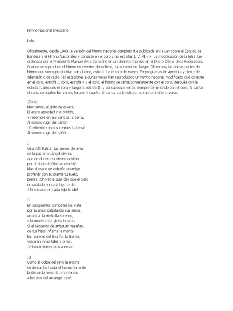 Nuestro himno nacional mexicano completo con 10 estrofas y con imagenes de algunos lugares y hechos de la historia de. La letra que contiene te llega hasta el corazón y en cualquier lugar donde se oiga. El himno nacional mexicano completo está compuesto por 4 estrofas y un coro. Estrofa v guerra, guerra sin tregua al que intente de la patria manchar los blasones, guerra, guerra, los patrios pendones en las olas de sangre empapad. Disfruta del hermoso himno nacional mexicano interpretado por el tenor mauro calderón con letra en el video y descripción.